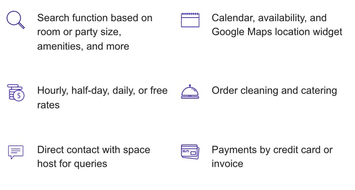 The type of flex space you offer is up to you. You can keep it simple, or go all-out with catering and cleaning options. Your users will be able to browse a full catalogue of your flex space offerings, and use them as break-out areas, brainstorming hubs, or simply as a quiet place to get some focused work done.