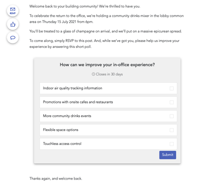 With Equiem, you can embed all kinds of forms in your content posts. You can also leverage our custom Polls feature to gather even more information from your users. With the example of the 'Welcome Back' mixer event, the poll is easy to see and quick to answer — it's a part of the content, and does not require leaving the platform. Even better, it is accompanied organically by an incentive: In this case, a fantastic community-building event.