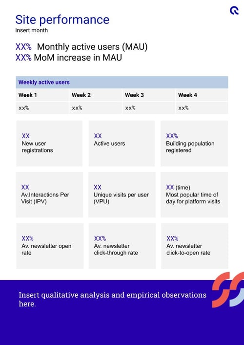 Equiem's Community Managers use the following reporting template as part of our standard Engage services. We track the key metrics listed above and condense them into an easily digestible format for the purpose of aiding our clients with analysis and high-level performance. This template is designed to supplement our clients' regular use of our Analytics Dashboards product — but we've rejigged it slightly to be agnostic, so you can use it with your own analytics solution.